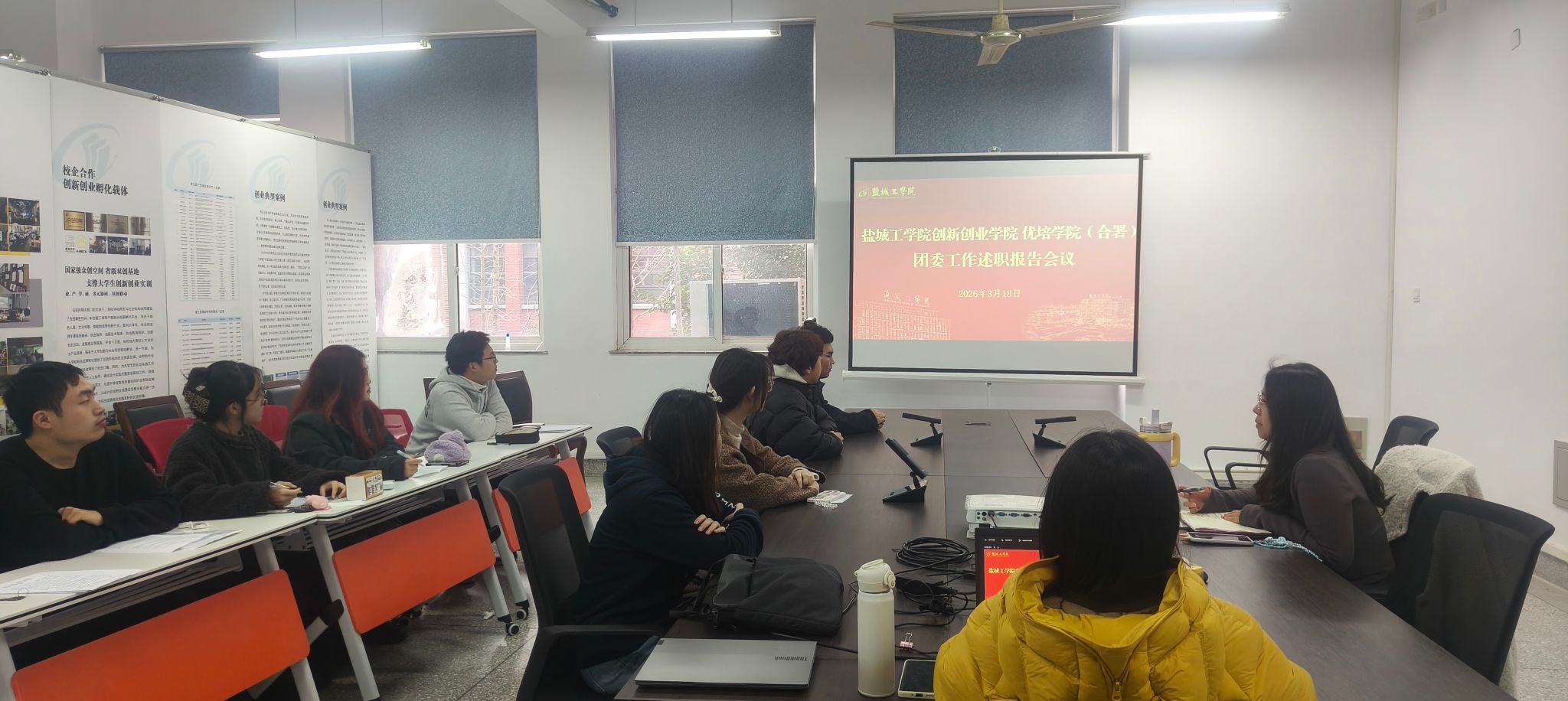 3月18日下午,创新创业学院、优培学院(合署)团委在仁和楼学院会议室组织召开团干部工作述职报告会暨团干部培训会议。学院团委书记全莹主持会议并作工作报告,团建部及各年级团支书参加会议。