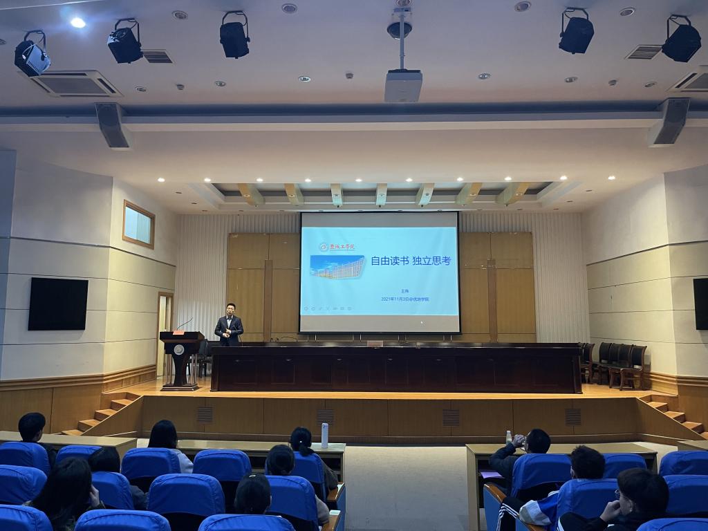 王伟做题为《自由读书,独立思考》专题报告。他介绍了盐工的发展历程和规划蓝图,优培学院、创新创业学院(合署)“强基础、宽口径、重后劲”的办学理念,并结合自己的求学经历讲述了他对大学的理解。他希望同学们能成长为“与人为善,有知识会思考、身心健康(团队合作能输赢)、感知并创造美、生存并快乐”的新时代大学生,并对大家提出三点要求:一是要认识大学,了解世界,认识自我,学会规划,在规划中成长,为自己的未来奠定坚实基础;二是自由读书,学会时空留白,具备独立思考的能力;三是通过读书认识世界,通过行路了解世界,通过阅人感知世界,让自律成为一种习惯,在优培遇见更优秀的自己。