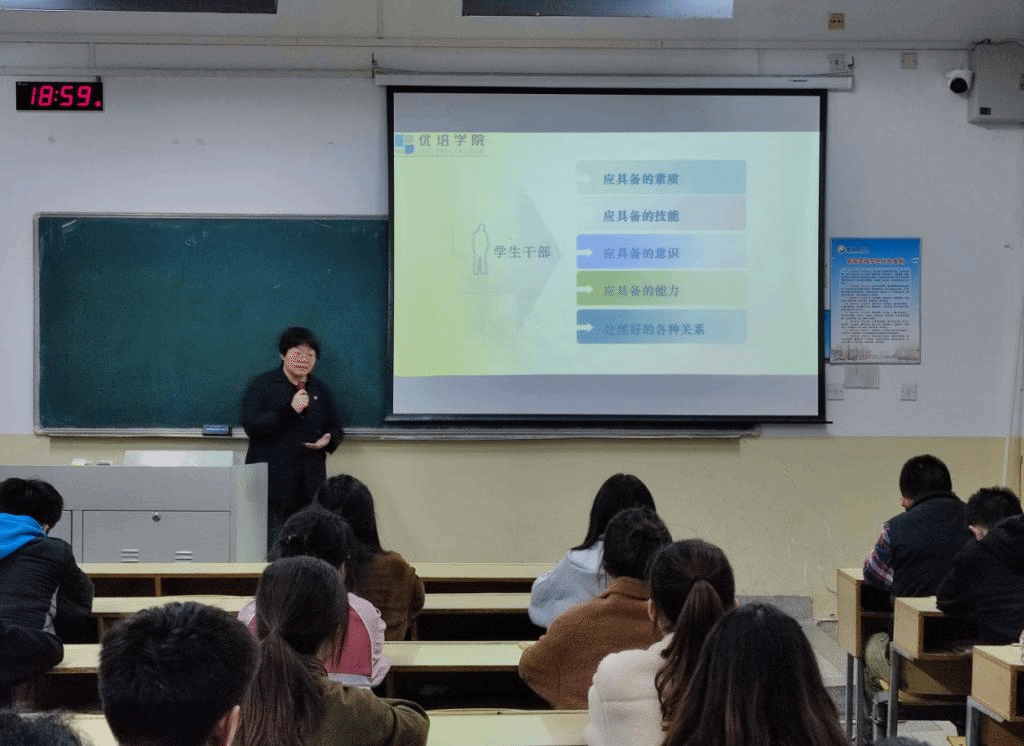 11月14日晚,在建军东路校区知行楼109,优培学院举行菁英人才培训班开班仪式暨“青马公开课”专题报告会。优培学院学工办主任、团委书记李凤芹主持并做“内强素质,外塑形象”主题报告,学院全体党员、学生干部和团员代表参加。