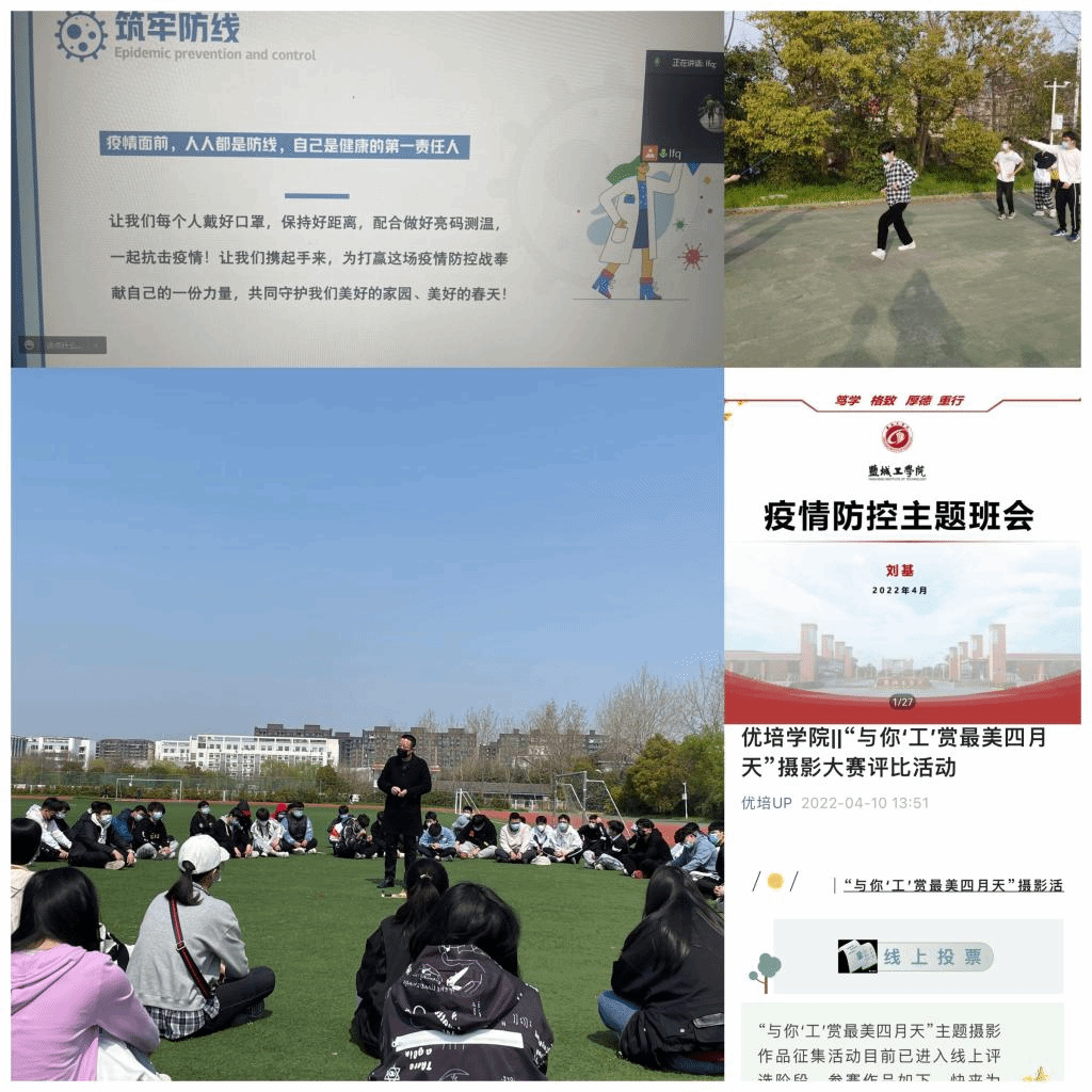 辅导员线上线下相结合,落实落细疫情防控相关工作。点对点的会议,让大家将“三件套”“五还要”牢记在心间;通过腾讯视频会议等线上形式召开疫情防控主体班会,全员集合,布置疫情防控相关工作。蓝天白云的操场上笑声阵阵,那是辅导员在对学生进行团体辅导,1米的距离,成为“文明线”,让秩序和文明成为靓丽风景线;“运动不打烊,抗疫有力量”趣味跳绳、与你“工”赏最美四月天,让大家走出宿舍,走向操场,走向户外,在欣赏盐工美景的同时,缓解了压抑的心情,一张张美丽的照片不仅是对盐工美景的纪念,更是对美好未来的期许。