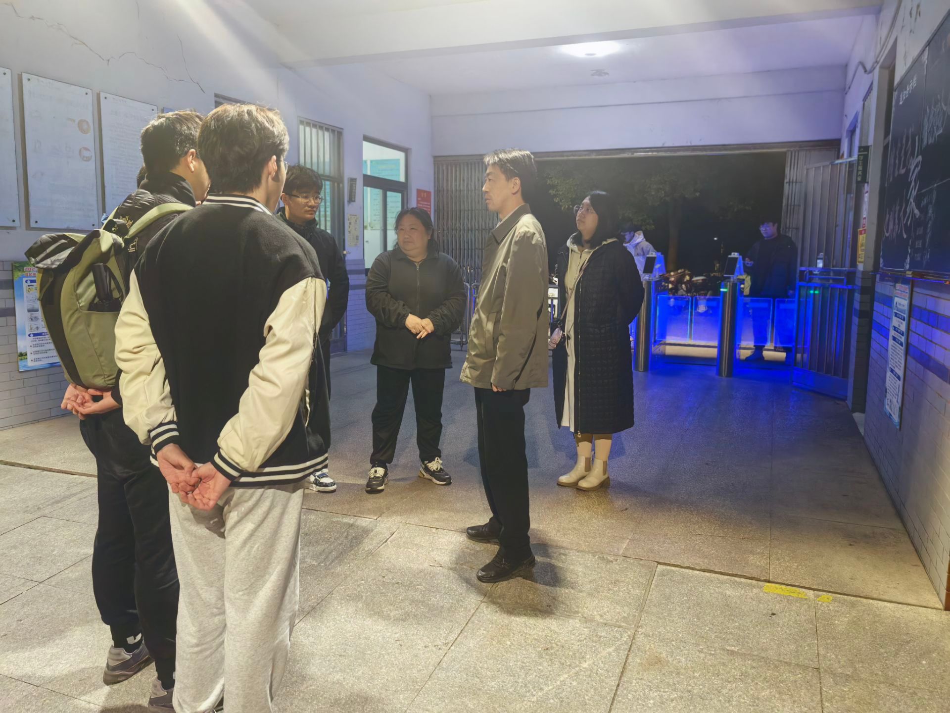 晚上10点,魏巍一行以“四不两直”方式深入学生宿舍走访,与宿管员沟通了解情况,全面检查宿舍晚归、安全和卫生情况。检查过程中,老师们与学生亲切交谈,询问近期学习和生活情况,强调按时归寝的重要性,提醒所有同学要严格遵守宿舍管理规定,时刻注意用电和消防安全,严禁违规使用大功率电器,并叮嘱同学们注意天气变化,及时增添衣物,养成良好的作息、卫生和劳动习惯,共同营造安全、有序、温馨的学习生活环境。老师们还仔细查看了“一站式”社区寝室文化节开展情况,对创建寝室文化、推进“一站式”社区建设提出意见。