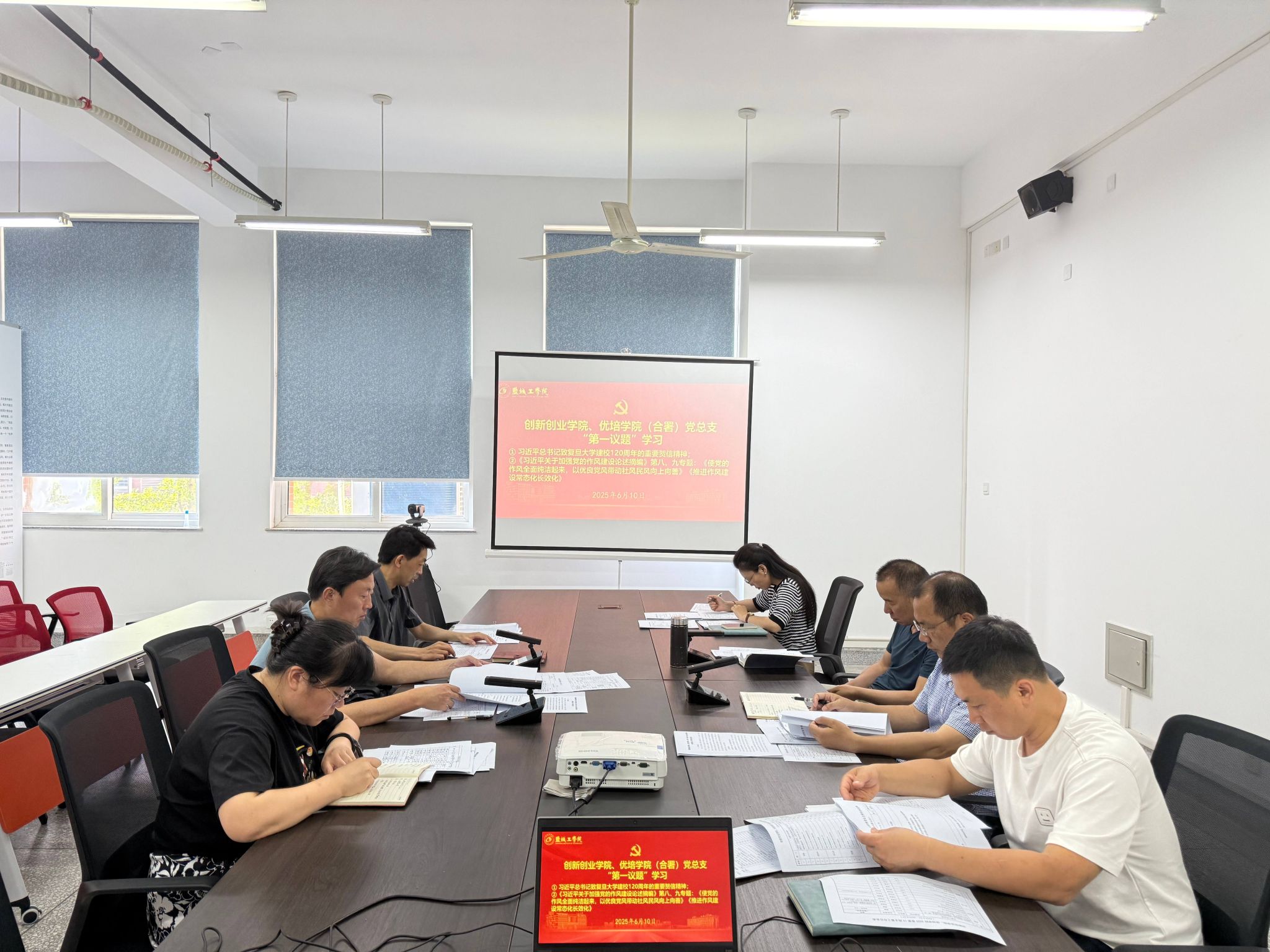2025年6月10日下午,在希望大道校区仁和楼A202东会议室,创新创业学院、优培学院(合署)党总支委员会“第一议题”,深入传达学习习近平总书记致复旦大学建校 120周年的重要贺信精神、《习近平关于加强党的作风建设论述摘编》第八、九专题:《使党的作风全面纯洁起来,以优良党风带动社风民风向上向善》《推进作风建设常态化长效化》。学院党总支书记魏巍主持,党总支成员和相关科室负责人参加学习。