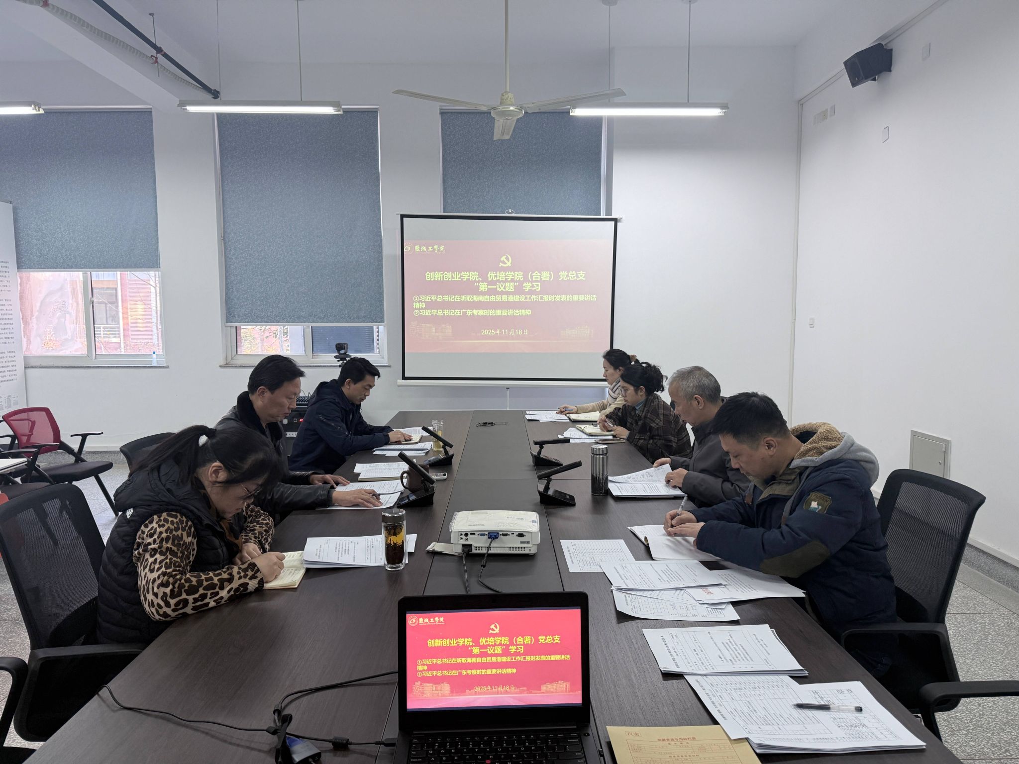 2025年11月18日下午,在希望大道校区仁和楼A202东会议室,创新创业学院、优培学院(合署)党总支委员会“第一议题”,深入传达学习习近平总书记在听取海南自由贸易港建设工作汇报时发表的重要讲话精神、习近平总书记在广东考察时的重要讲话精神。学院党总支书记魏巍主持,党总支成员和相关科室负责人参加学习。