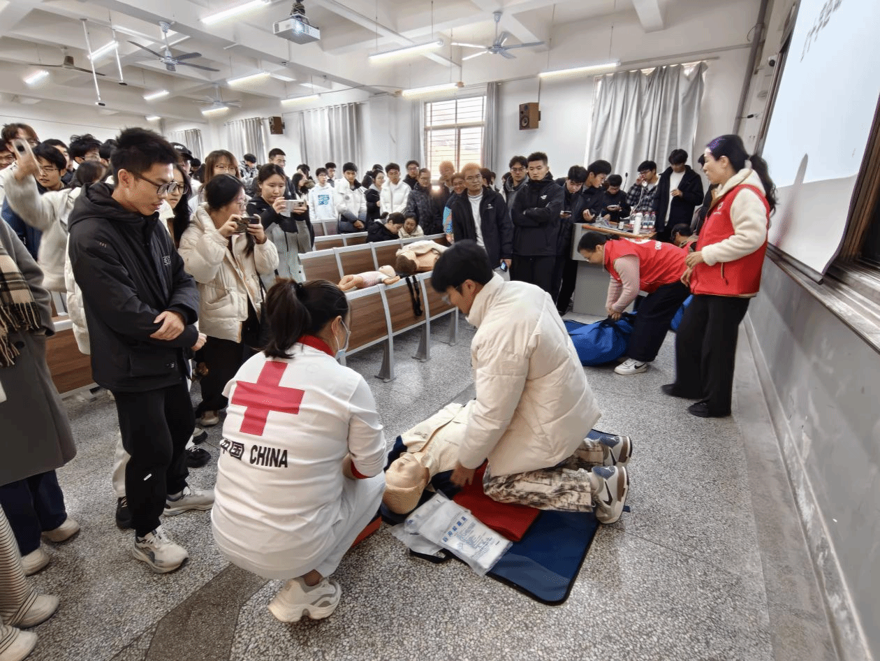 为将生命安全教育融入新生入学核心环节,学院携手盐城市红十字会在体知楼开展心肺复苏(CPR+AED)专题培训。市红十字会蔡裕宁、卢颖华、姚凌受邀指导,张琼丹等四位老师授课,辅导员张子怡参与其中。蔡裕宁老师以“红十字运动的人文精神”为切入点,结合真实案例强调心肺复苏“黄金救援”作用,呼吁新生认真学习、转化技能。培训采用“线上理论考试+现场技能考核”模式,新生需独立完成完整急救流程,考核合格者获培训合格证明,切实掌握急救技能、树立安全意识。