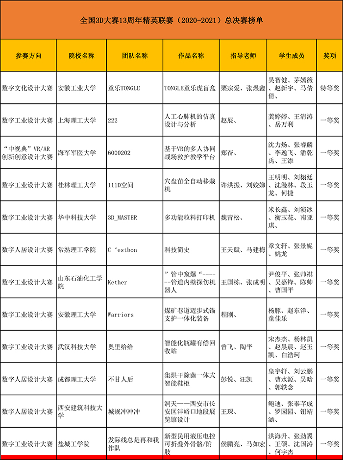 全国3D大赛13周年精英联赛(2020-2021)自2020年9月25日启动以来,全国31个省/直辖市/自治区赛区,大学生组和研究生组共有389所高校,680个院系报名参赛,共提交了5556件初赛作品。2021年4月15日,精英联赛省赛作品提交截止,各赛区、各院校经初赛/校赛、网络海选等方式,共推荐报送省赛团队2953个,作品2953件。本次全国3D大赛13周年精英联赛(2020-2021)总决赛有近300个团队参与国赛角逐龙鼎大奖。