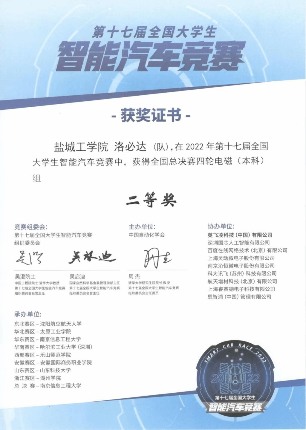 近日,第十届全国大学生智能车竞赛全国总决赛结果公布,我院参赛师生克服重重困难,与来自清华大学、北京科技大学、哈尔滨工业大学、西北工业大学、华中科技大学、同济大学等高校选手激烈角逐,最终获得二等奖2项。